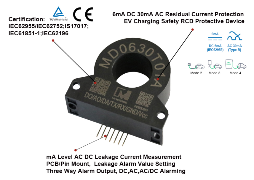 To satisfy new standards including IEC 62955, IEC 62752, IEC 61851-1,and UL 2231-1 etc, the charging of electric vehicles requires leakage current sensors to avoid hazardous situations in cases where the vehicle battery(DC) is connected to the home power supply(AC). Generally, AC DC Sensitive residual current sensors can be used where DC and AC circuits are directly connected and therefore AC DC leakage currents occur. Our evse components would be required to guarantee safety in the event of DC fault current.